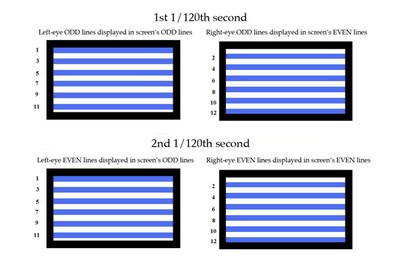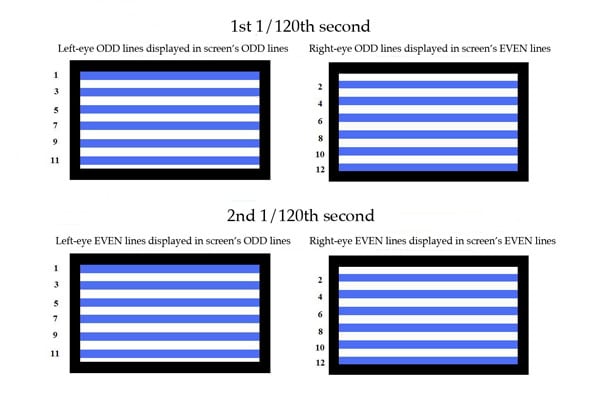 Passive 3D flat panels work by using a form of interlacing, like your old CRT television set. Another name for passive 3D is FPR because it uses a Film Pattern Retarder filter on the screen to oppositely polarize alternating lines in the image—the left eye sees the odd-numbered lines, while the right eye sees the even-numbered lines, then vice-versa at a rate of 120 times per second (Hz).